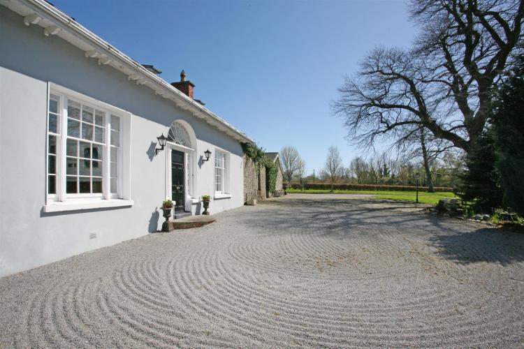 A gravelled driveway passes the original gate lodge, leading to the front and rear courtyards.