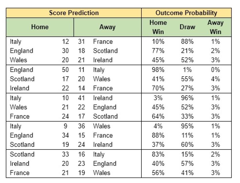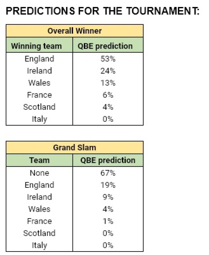 The predictions are based on analysis by QBE actuaries of scores, results, past events and incidents over the last 10 years using a wide range of variables including the number of tries, kicks and conversions scored by the teams, the caps of each captain, latest world ranking and home and away advantage.