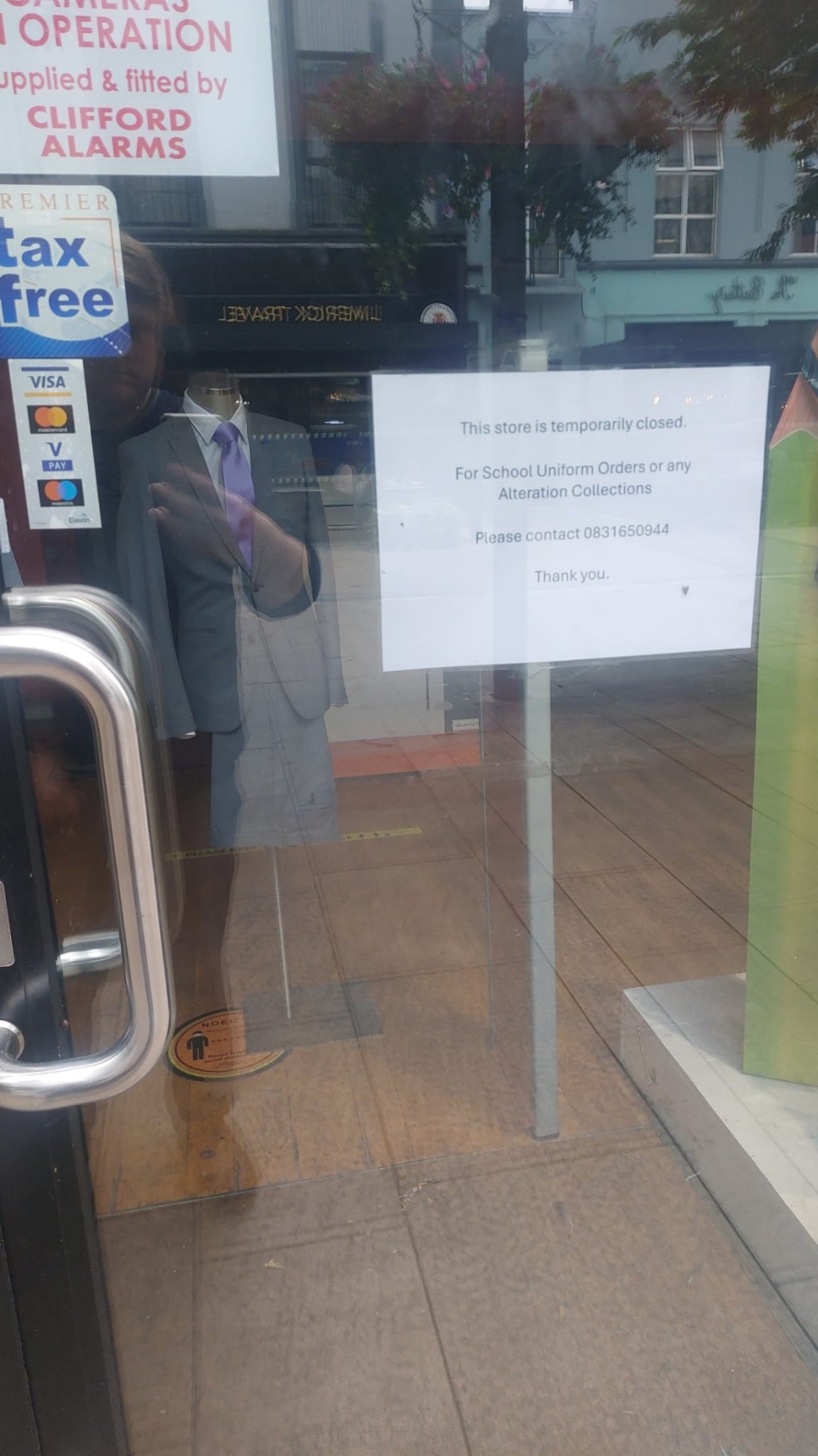 These signs also give information about a telephone number to call for school uniform collections or alterations.