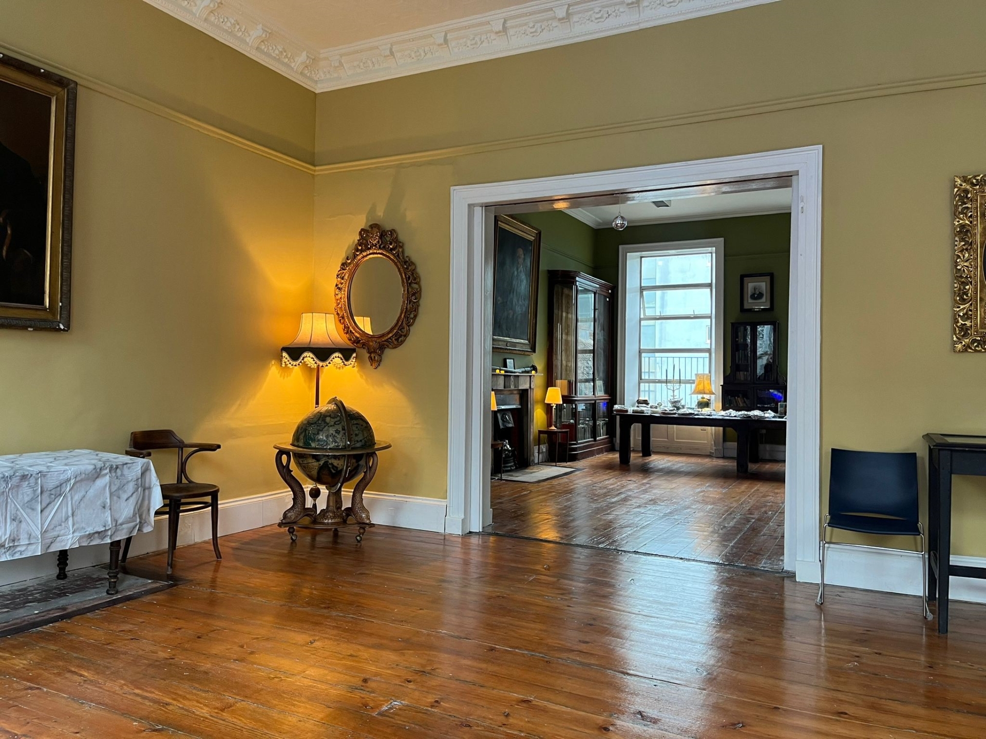 The area has been transformed into an 18th century inspired space with gilt mirrors, large portraits and silk hangings.