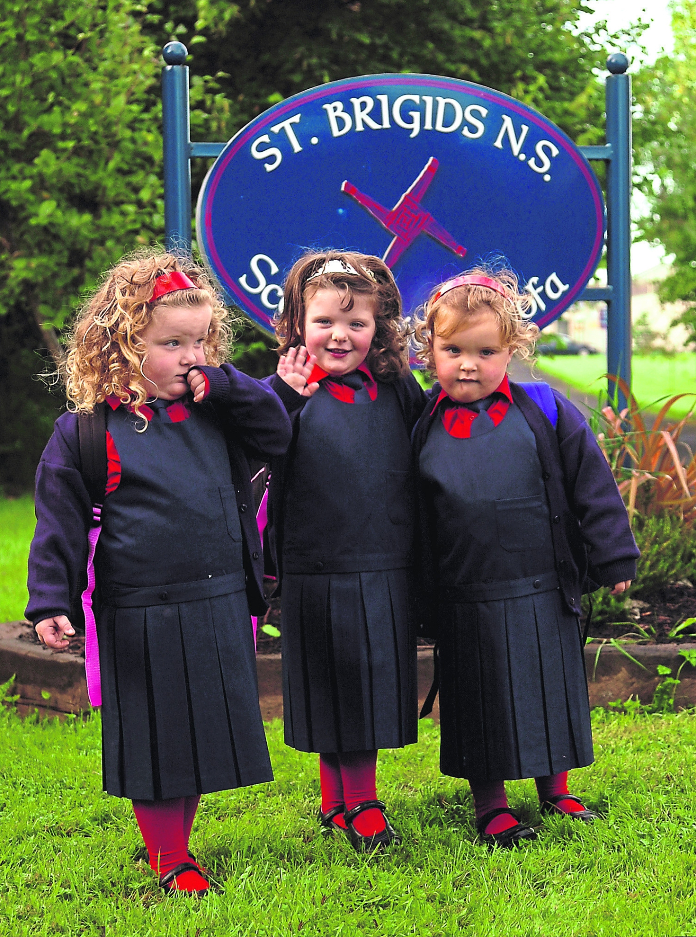 Deirdre, Joanne and Rachel Cross pictured on their first day attending Ard Scoil Mhuire. Below, their first day at St Brigids National School