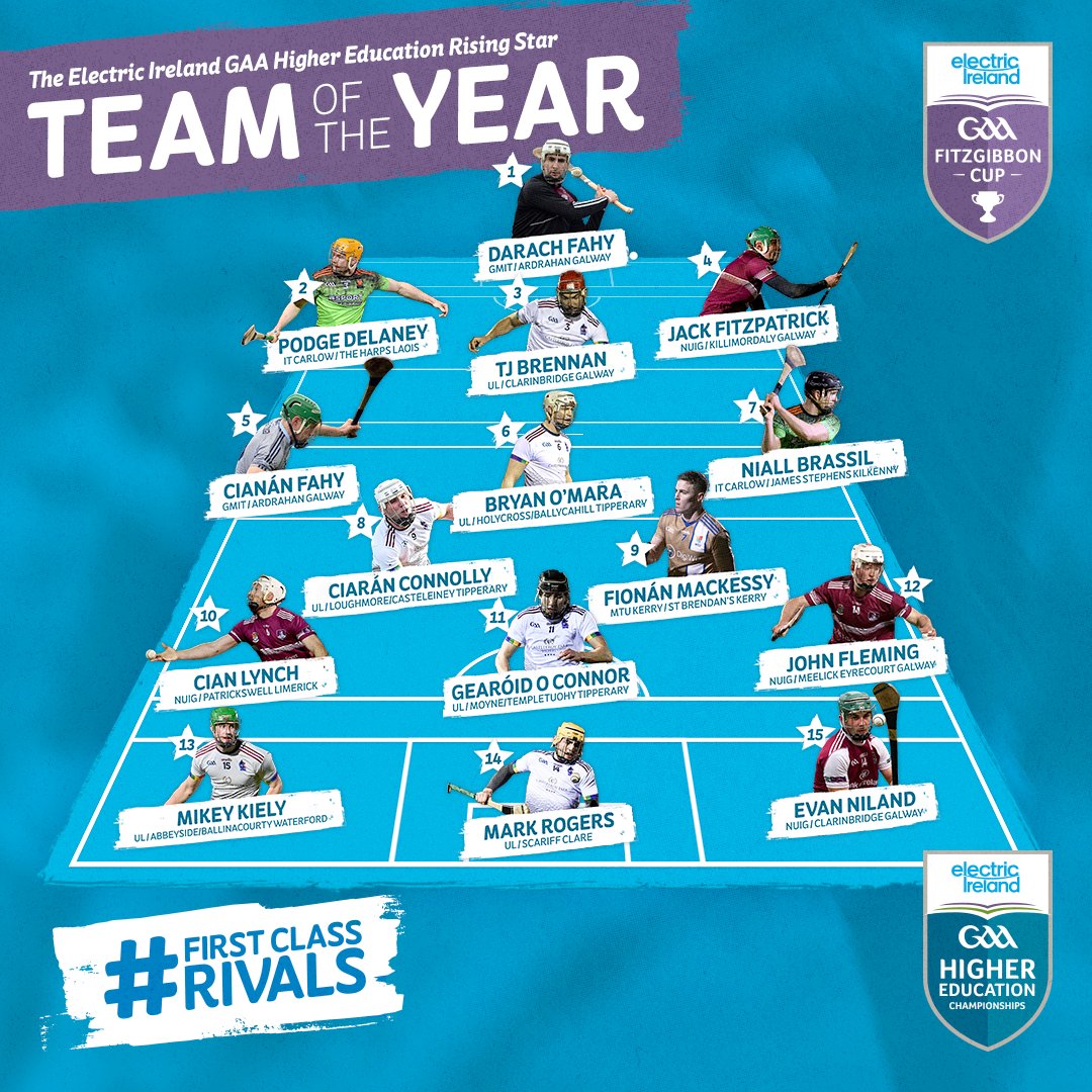 TEAM: Darach Fahy (GMIT, Ardrahan, Galway); Podge Delaney (IT Carlow, The Harps, Laois), TJ Brennan (UL, Clarinbridge, Galway), Jack Fitzpatrick (NUIG, Killimordaly, Galway); Cianán Fahy (GMIT, Ardrahan, Galway), Bryan O Mara (UL, Holycross-Ballycahill, Tipperary), Niall Brassil (IT Carlow, James Stephens, Kilkenny); Ciaran Connolly (UL, Loughmore-Casteleiney, Tipperary), Fionan Mackessy (MTU Kerry, St Brendans, Kerry); Cian Lynch (NUIG, Patrickswell, Limerick), Gearoid O’Connor (UL, Moyne-Templetuohy, Tipperary), John Fleming (NUIG, Meelick Eyrecourt, Galway); Mikey Kiely (UL, Abbeyside-Ballinacourty, Waterford), Mark Rodgers (UL, Scariff, Clare), Evan Niland (NUIG, Clarinbridge, Galway).