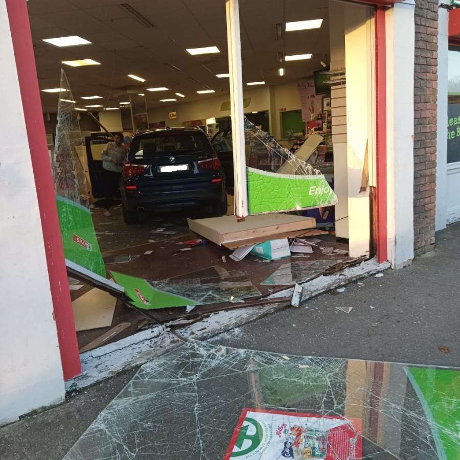 Gardaí attended the scene of the dramatic single-vehicle incident which saw a car plough through the shopfront of the retail store shortly before 5pm this Wednesday.