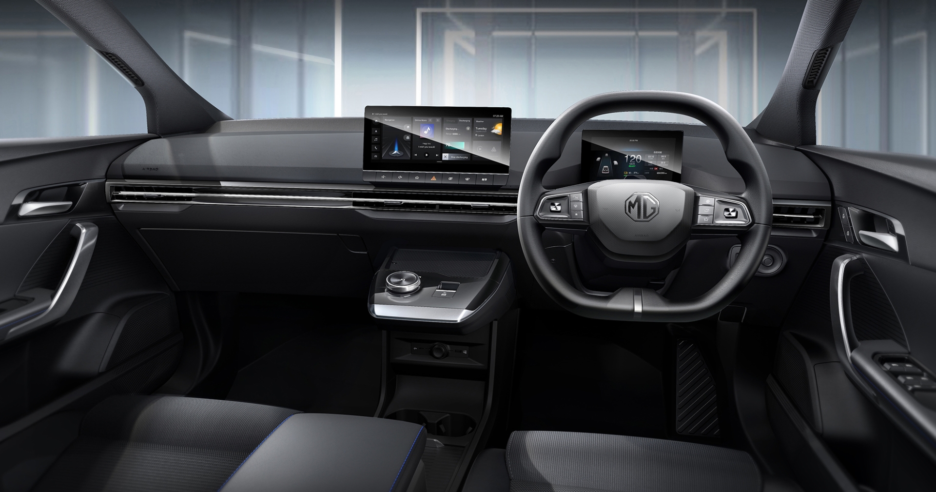 The exterior is a work of art with dynamic lines and sharp shapes. There’s nothing quite like it on our roads. The MG badge is proudly displayed front and back. Distinctive futuristic LED headlights look the business while there’s nothing quite like the rear design with its sporty dual-wing spoiler, horizontal taillight and the crisscross shaped decorative lights.