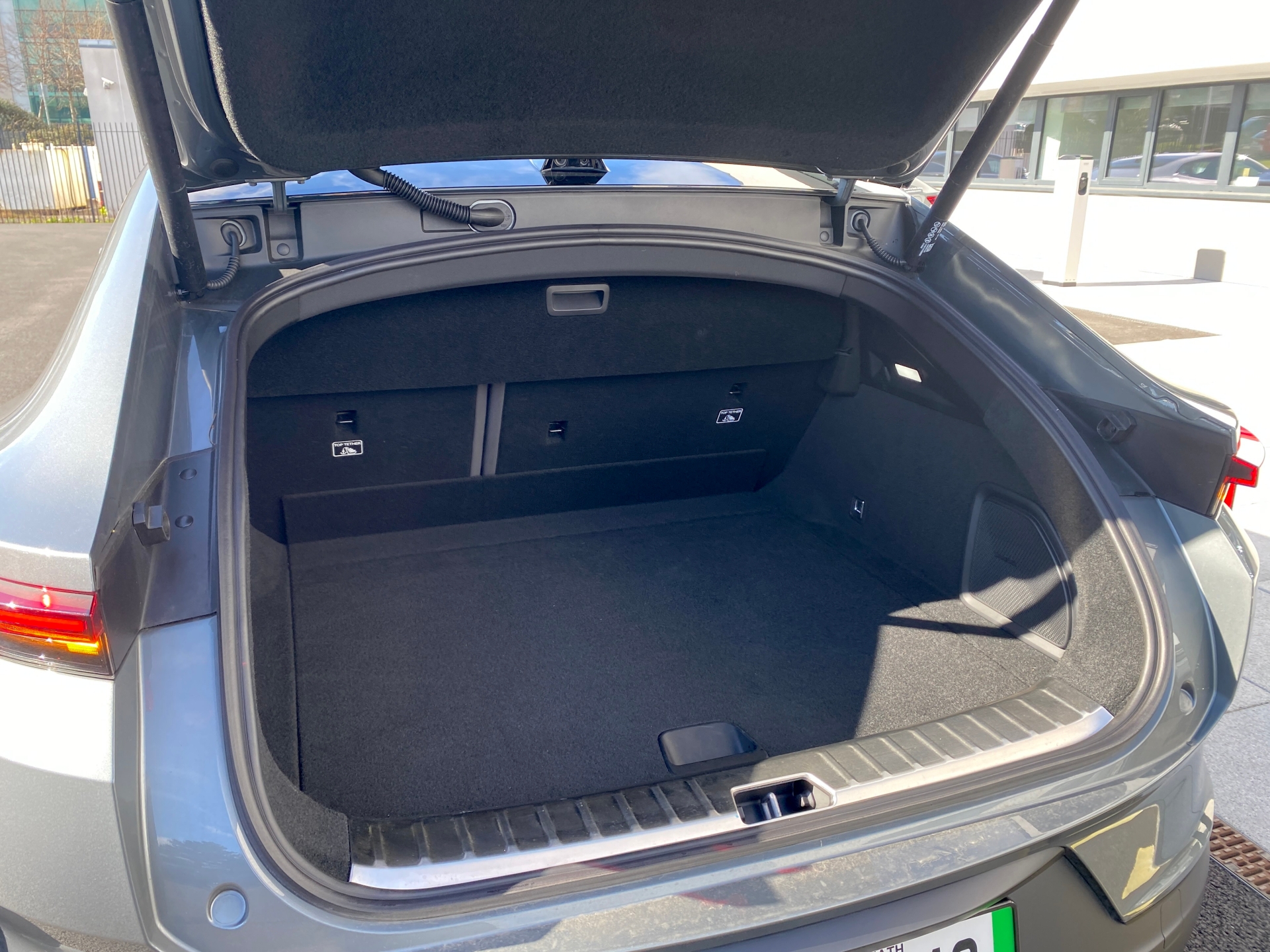 The boot is opened by pressing a dark rectangle on the boot door. Luggage space is a very decent 520 expandable to 1,536 litres, and the floor level can be adjusted. A deep area below stores a tyre repair kit and cables, or you can put these in the 15-litre frunk under the bonnet.
