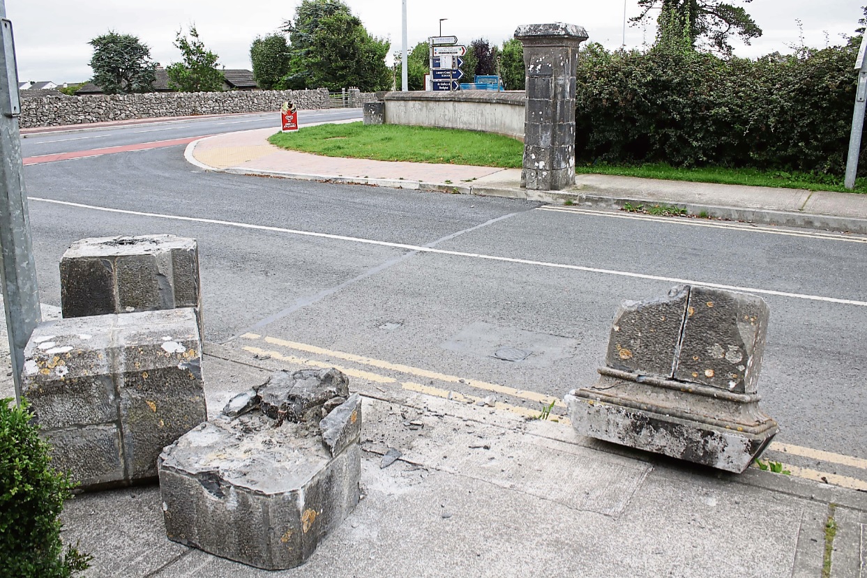 The stone column at the gates of Mungret College after it was damaged in the early morning incident Pictures: Michael Cowhey