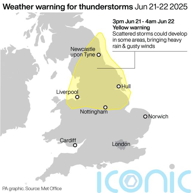 This comes after a yellow warning for thunderstorms, covering parts of south-east Scotland, Yorkshire, the Midlands and Wales was issued by the Met Office from 5pm on Saturday until 3am on Sunday.
