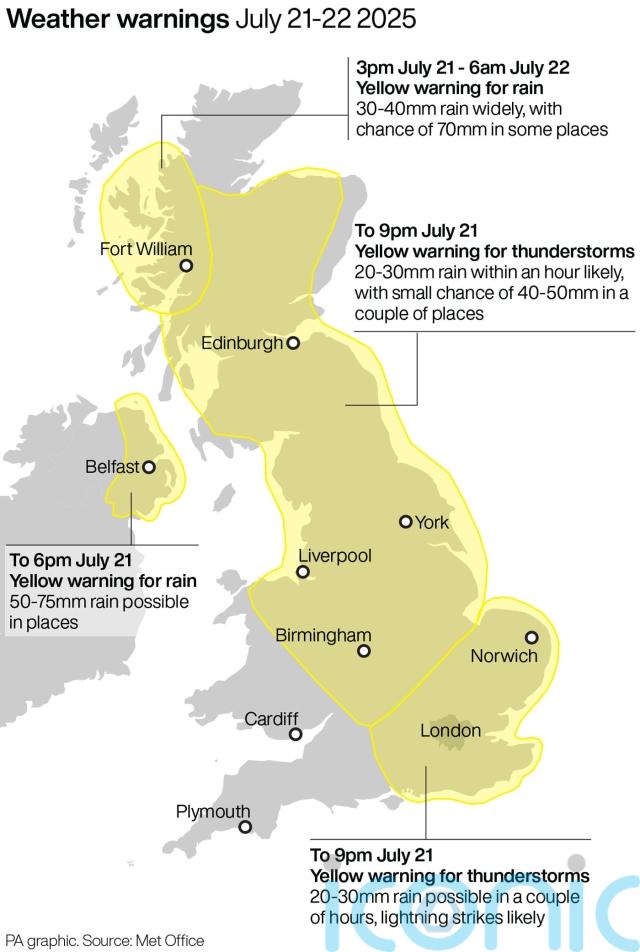 Heavy, thundery downpours are forecast to hit parts of the UK, with an amber weather warning for rain in place until 8am on Monday for the east of Northern Ireland.