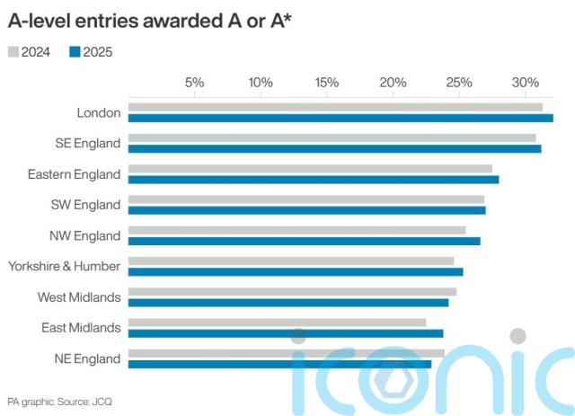Some 32.1% of entries in the capital were awarded A or A* this year, the highest for any region in England and up from 31.3% in 2024.