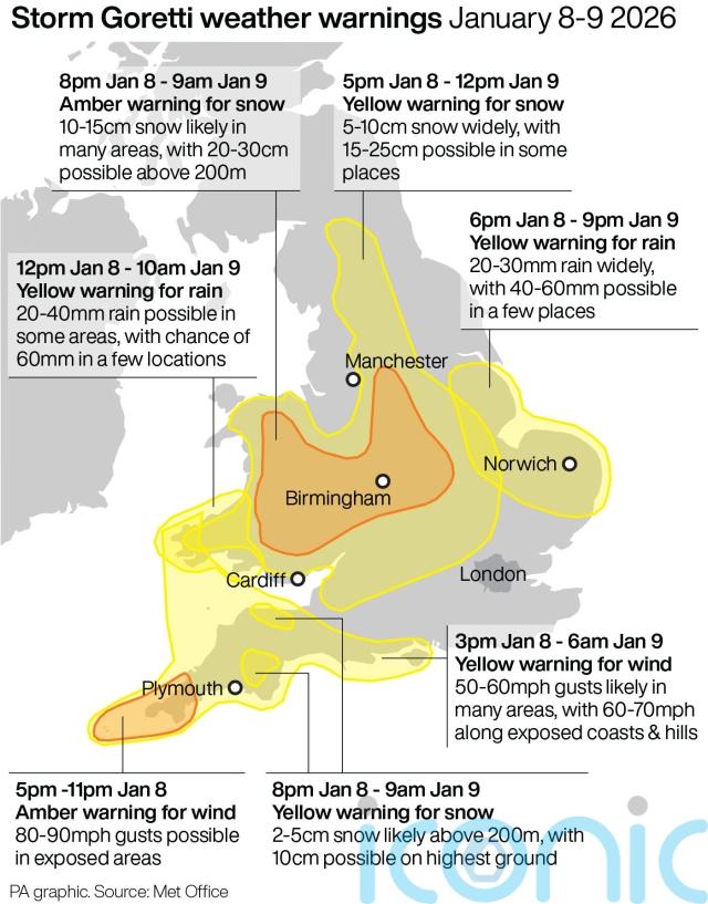 Amber weather warnings have been issued across the UK with Storm Goretti set to bring heavy snowfall and strong winds.