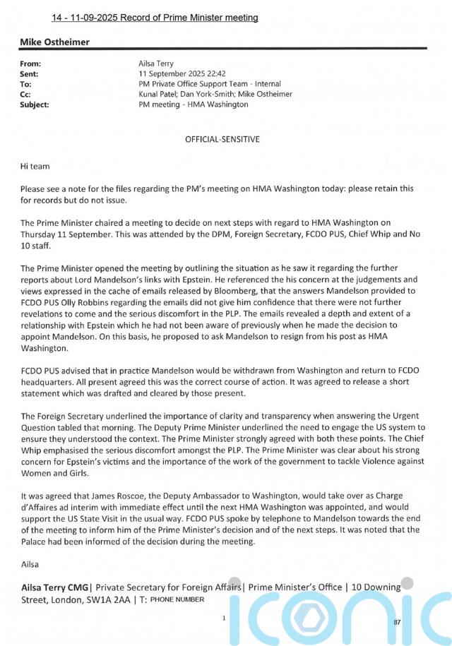 The 31 files released by the Government on Wednesday did not include correspondence between No 10 and Lord Mandelson, in which a number of follow-up questions were asked about his relationship with Epstein.