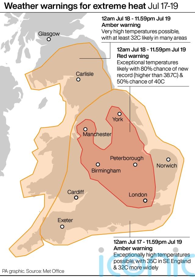 He added in a separate statement: “It’s important that we all continue to follow public health advice to keep cool, and take simple precautions like drinking lots of water and seeking shade, and also checking on vulnerable friends and neighbours.”
