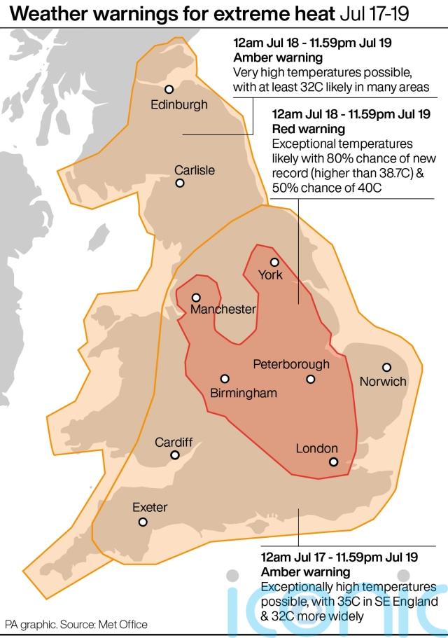The UK’s first red extreme heat warning has also been issued by the Met Office across a large part of England from London to Manchester and York on Monday and Tuesday.