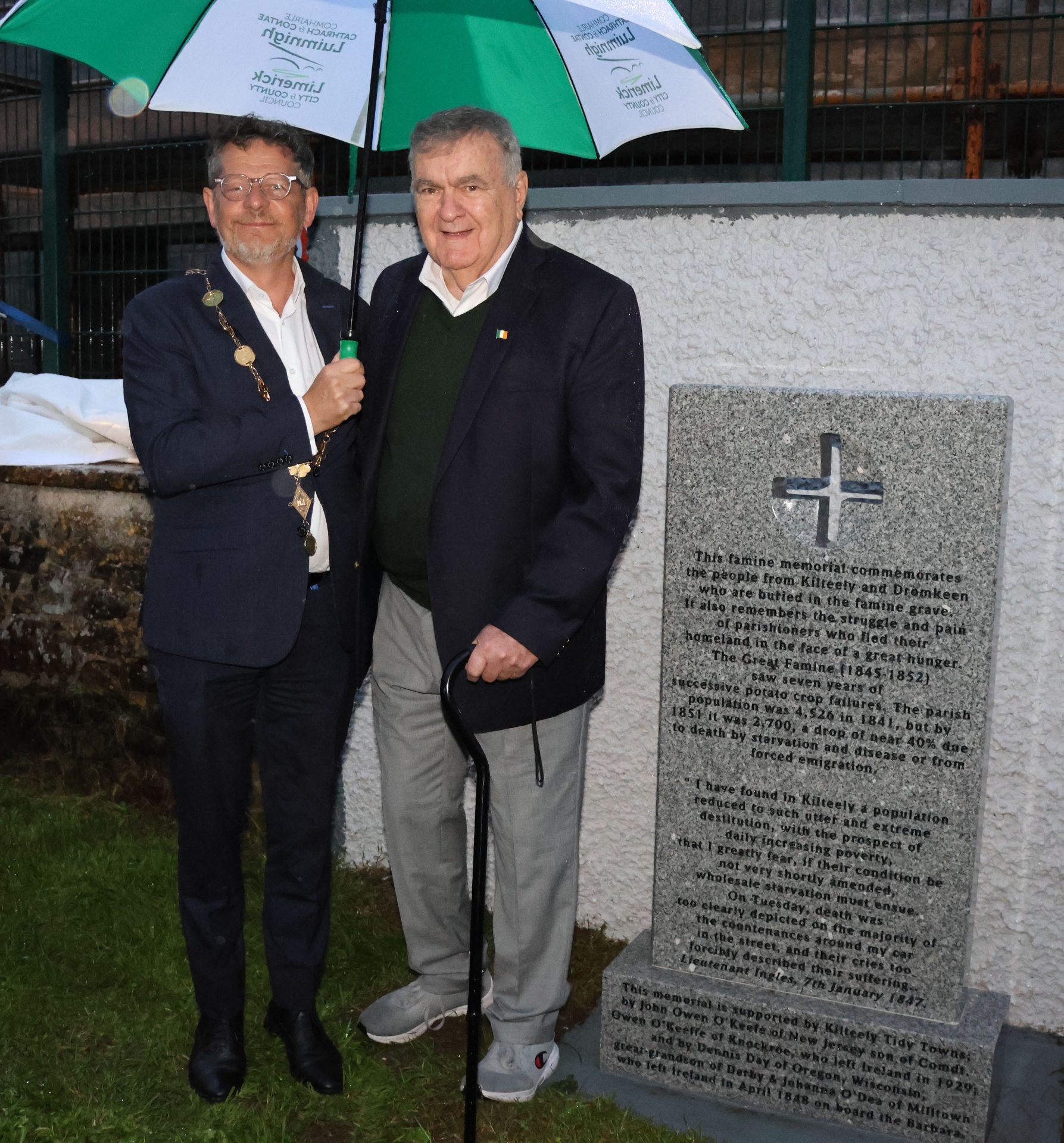 The memorial stone was unveiled at the village graveyard in Kilteely by the Mayor John Moran and John Owen O'Keefe, New Jersey, one of the benefactors who supported the erection of the memorial