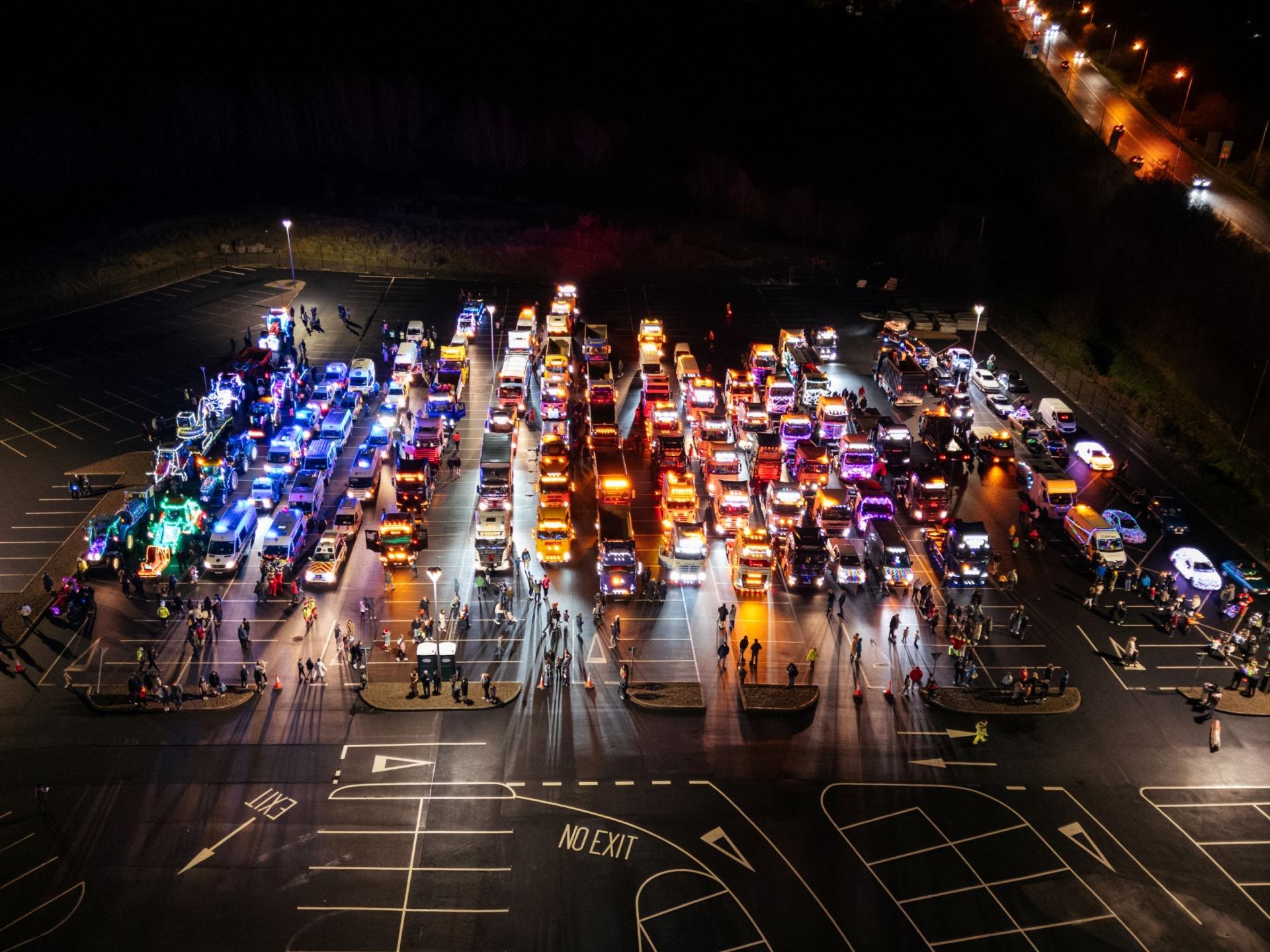 The rain couldn't dampen the electric atmosphere during the festive, light-filled convoy of ambulances, trucks, tractors, cars and bikes.