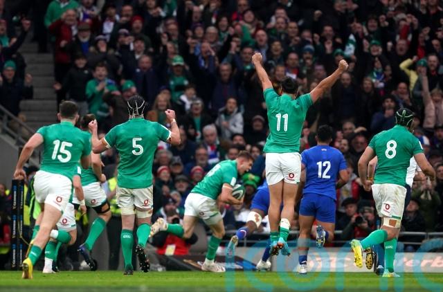 First-half tries from Hugo Keenan, James Lowe and Andrew Porter helped the Irish lead 22-16 at the end of a pulsating opening period before Garry Ringrose’s late score fatally ended French resistance and bagged a bonus point.