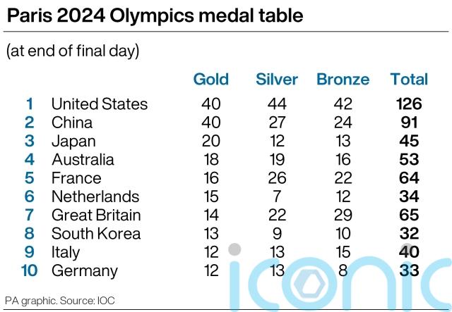 Great Britain ended the Paris Olympics with 65 medals – the same amount won at London 2012 and second-best ever tally on foreign soil – with only the United States (126) and China (91) claiming more.