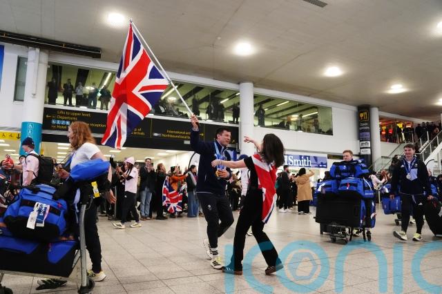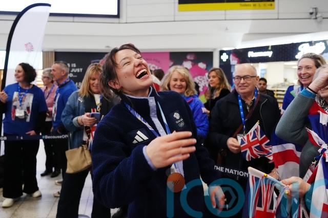 Skeleton racer Matt Weston led athletes into the arrivals hall at Gatwick Airport on Monday lunchtime, wearing his two gold medals and waving the Union Flag.