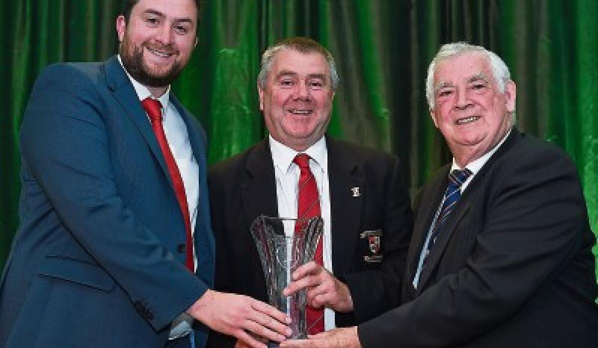 Dave Connolly, of Geraldine AFC, Limerick, Co. Limerick, is presented with his John Sherlock award for services to football by Adrian Sherlock, left, and FAI President Tony Fitzgerald, right, at the F