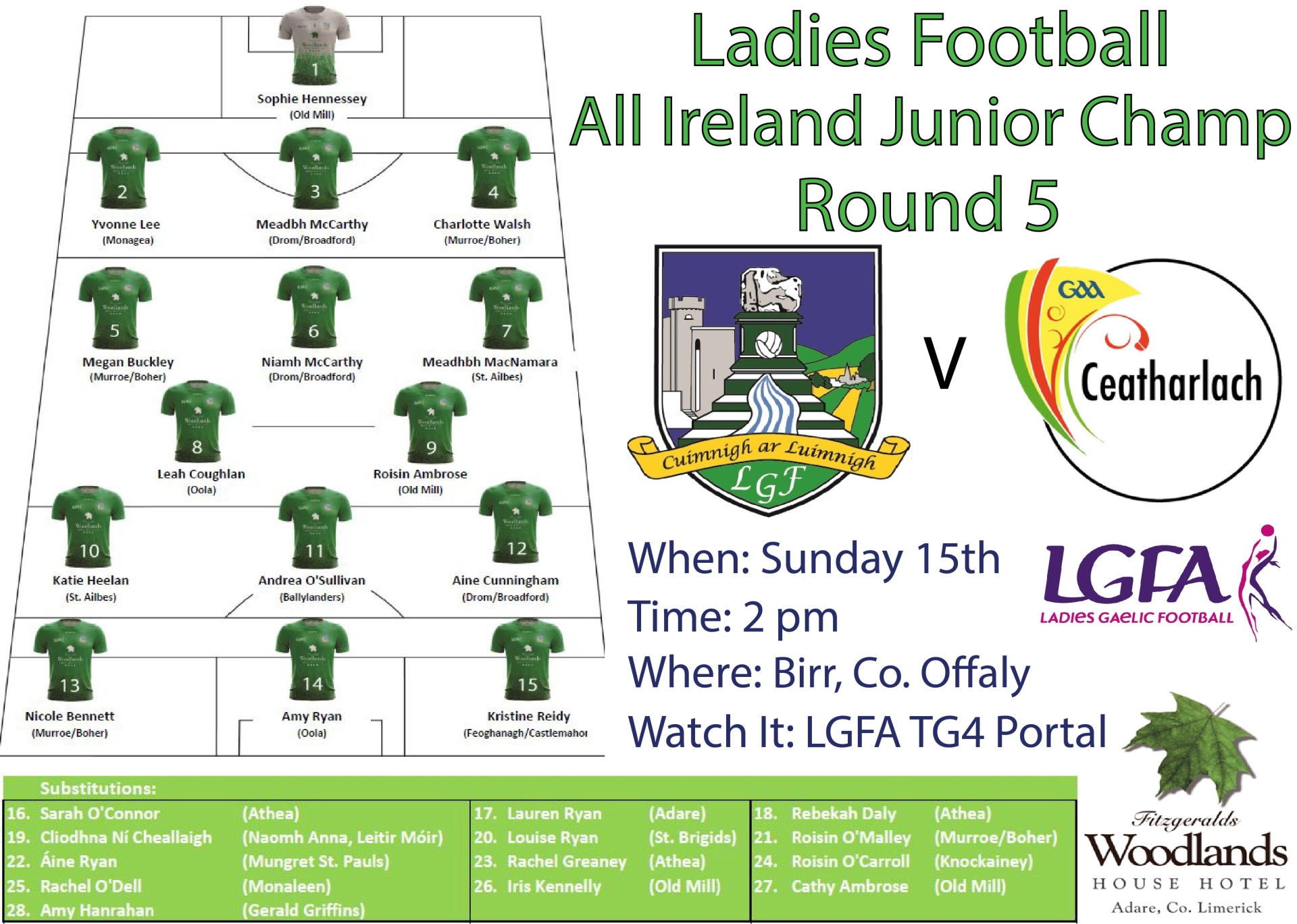 LIMERICK: Sophie Hennessey (Old Mill); Yvonne Lee (Monagea), Maedbh McCarthy (Dromcollogher-Broadford), Charlotte Walsh (Murroe-Boher); Megan Buckley (Murroe-Boher), Niamh McCarthy (Dromcollogher-Broadford), Meadhbh MacNamara (St Ailbes); Leah Coughlan (Oola), Roisin Ambrose (Old Mill); Katie Heelan (St Ailbes), Andrea O'Sullivan (Ballylanders), Aine Cunningham (Dromcollogher-Broadford); Nicole Bennett (Murroe-Boher), Amy Ryan (Oola), Kristine Reidy (Feohanagh-Castlemahon). Subs: Sarah O'Connor (Athea), Lauren Ryan (Adare), Rebekah Daly (Athea), Cliodhna Ni Cheallaigh (Naomh Anna, Leitir Mor), Louise Ryan (St Brigids), Roisin O'Malley (Murroe-Boher), Aine Ryan (Mungret St Pauls), Rachel Greaney (Athea), Roisin O'Carroll (Knockainey), Rachel O'Dell (Monaleen), Iris Kennelly (Old Mill), Cathy Ambrose (Old Mill), Amy Hanrahan (Gerald Griffins).
